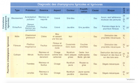 | + | [[Fichier:Caractéristiques des champignons lignicoles et lignivores.png|vignette|463x463px|Caractéristiques de développement et d'aspect des champignons lignicoles et lignivores.Tableau issu de l'article de Paule Delcambre (2001), ''Les désordres des bâtiments anciens: la biodégradation'', Revue Maisons Paysannes de France, n°142, 4T, p. 35. ©]] | ||