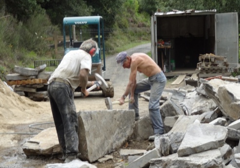 | + | Travail de la pierre.jpg|Artisans en train de dégrossir le bloc de schiste sur le chantier du Pont de Chaldecoste. Photo Maisons Paysannes de France - Prix René Fontaine © | ||