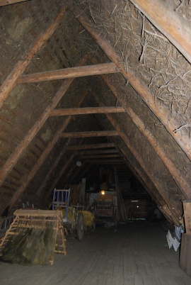 Vue intérieure d'une charpente couverte de genêts.Photo Bernard Leborne ©