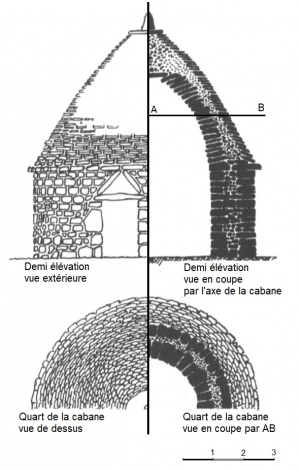 Découvrez-là !La voûte est à encorbellement, c'est à dire réalisée avec des pierres en saillie vers l'intérieur par rapport à celles qu'elles superposent afin de constituer une couverture qui se rejoint au fur et à mesure de la montée. Dans une cabane, la pierre du dessus dépasse généralement d'un tiers (ou moins) de la pierre qu'elle superpose.