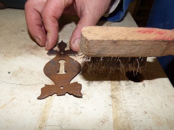 Photo d'une brosse métallique servant à brosser le cadre d'une serrure. Photo Christophe Barroy © Maisons Paysannes de France, délégation de la Sarthe.