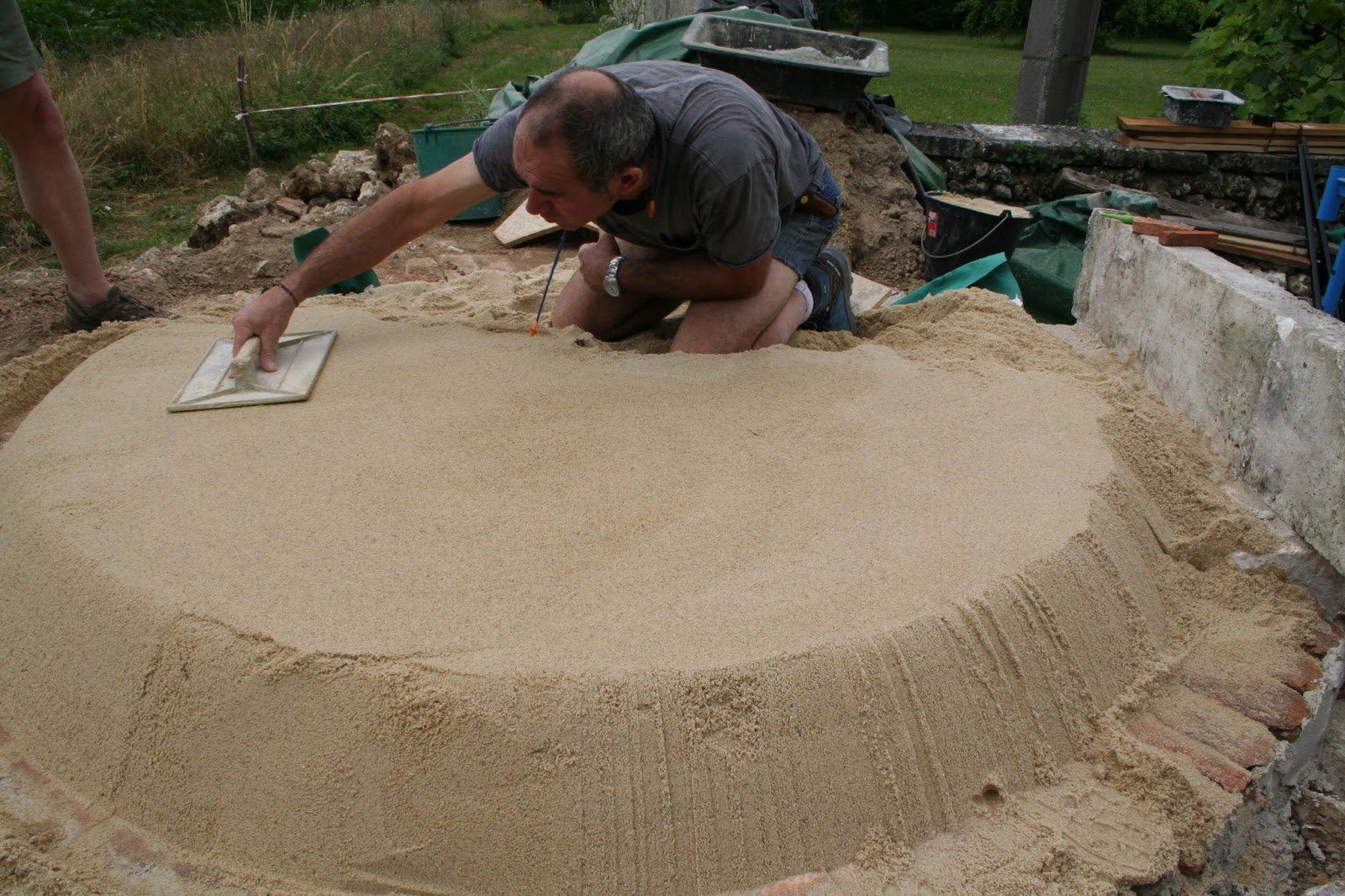 Lissage du sable pour réaliser un coffrage à la voûte. Photo Maisons Paysannes de France, Délégation Dordogne-Périgord ©