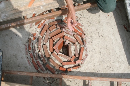 1. Le coffrage de la voûte est réalisé avec une butte de sable ou de terre bien tassée et lissée de la forme souhaitée. Cela permet ainsi d’éviter des cassures de courbes lors de la pose de maçonnerie. Une voûte en forme d’hémisphère aplati est d’autant plus facile à chauffer puisqu’elle est plus proche de la sole.